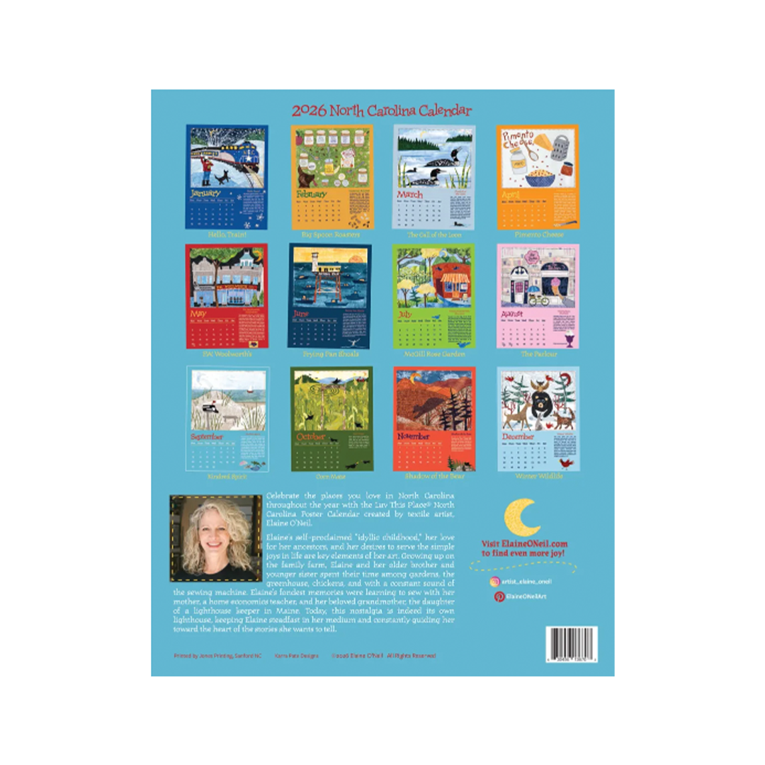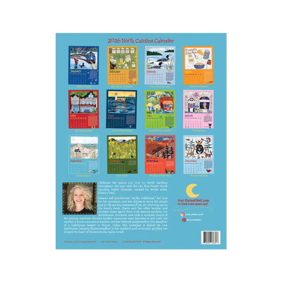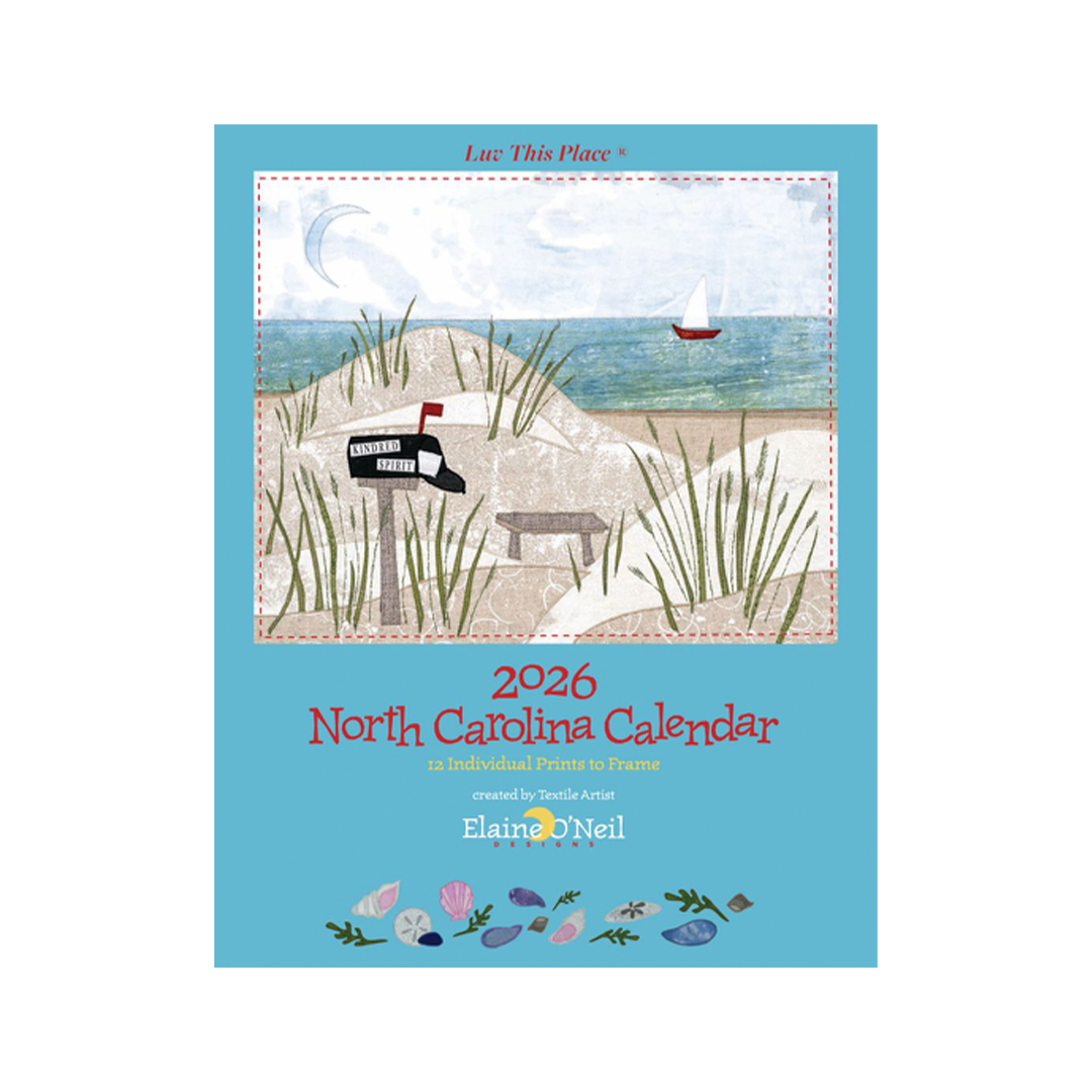 Add some joy to your routine with this beautiful calendar from Hillsborough, NC-based artist, Elaine O’Neil. Featuring twelve unique, frameable 11 x 14-inch posters of iconic North Carolina scenery, shops, and products, created in Elaine’s signature style using textiles and mixed media, this calendar is a gorgeous way to welcome 2026 with open arms.