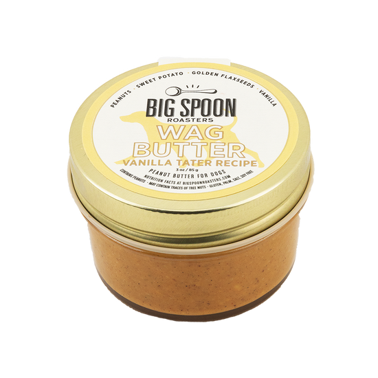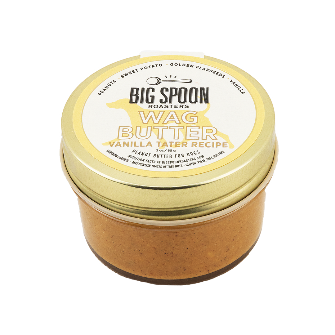 Handcrafted in small batches with fresh-roasted High-Oleic Runner peanuts, real sweet potato, golden flaxseed, and ground Ugandan vanilla beans, Vanilla Tater Wag Butter is like sweet potato pie, made pup-friendly!