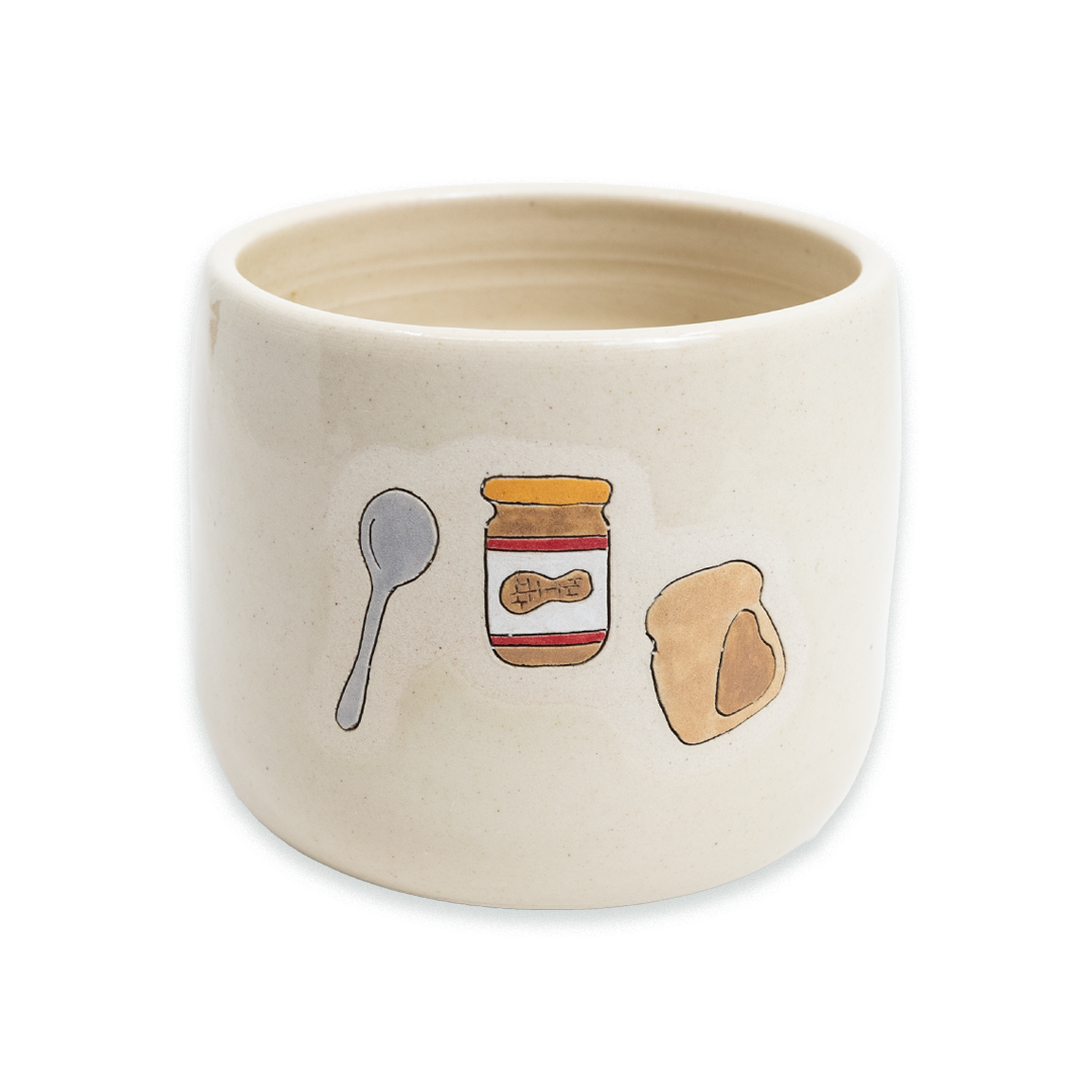 Decorated with nostalgic, sticker-inspired iconography of your go-to peanut butter & toast breakfast, snack, or spoonful, this adorable ceramic tumbler is our new favorite vessel. Handmade with intention (sound familiar?) by our friend Katy of Ware Ware Studio, this tumbler holds about 8oz (1 cup), ideal for your morning coffee, breakfast yogurt bowl, scoops of ice cream, and any snack or sip in between!
